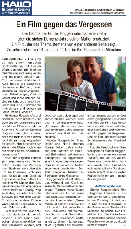 Der Baldhamer Günter Roggenhofer hat einen Film über die sieben Demenz-Jahre seiner Mutter produziert. Ein Film, der das Thema Demenz von einer anderen Seite zeigt. Zu sehen ist er am 14. Juli, um 1...